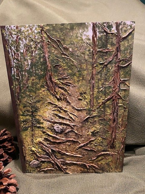 It all starts with a wooden keepsake box, stained in dark espresso, waiting to hold small wonders and wild memories. Then I layer acrylic paint and molding paste to bring the forest to life, forming tactile roots and tree trunks that pull you into the path. For those who want to get lost in the woods, listen to its whispers, and explore.
